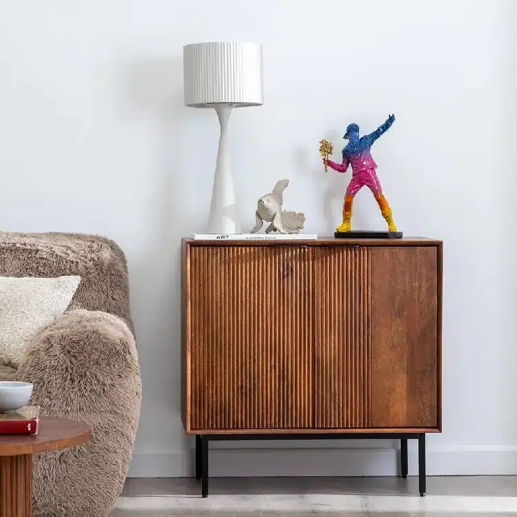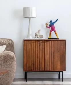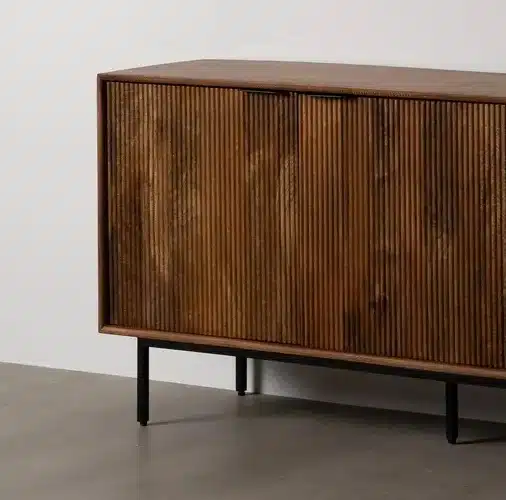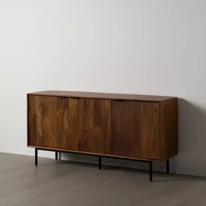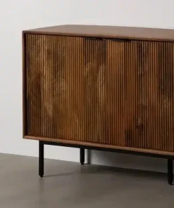 En ella encontrarás este elegante Aparador ,fabricado en madera de mango acabado en un bonito marrón veteado. La parte frontal de las puertas está parcialmente grabada con líneas verticales.