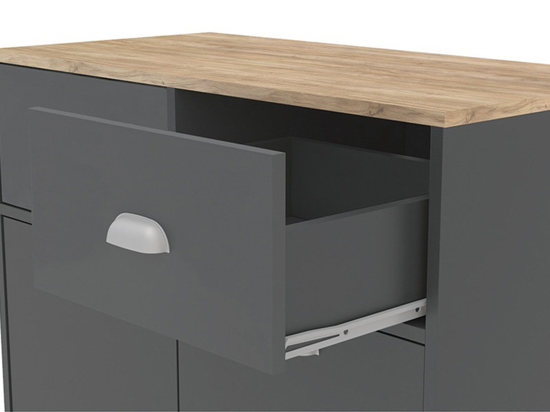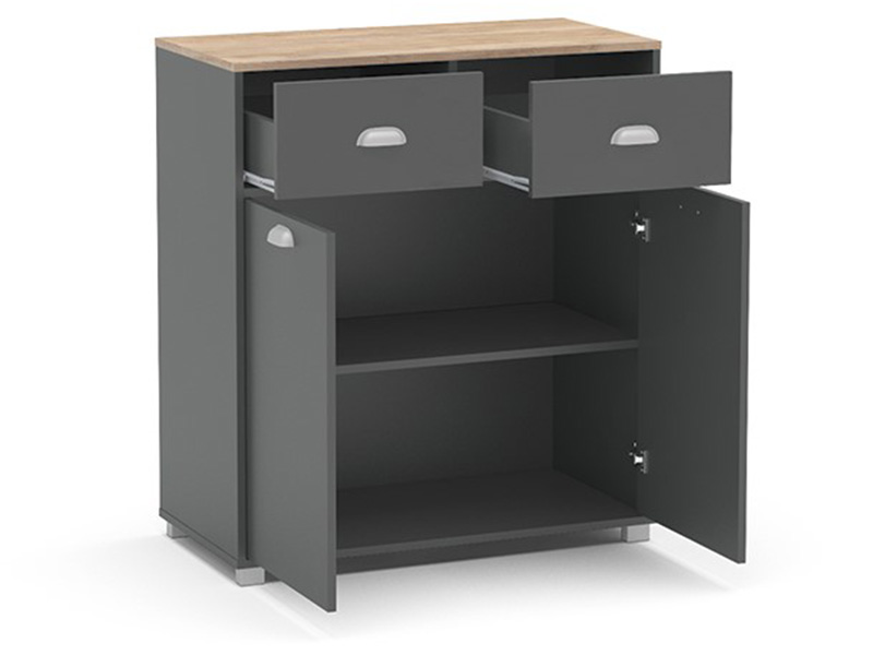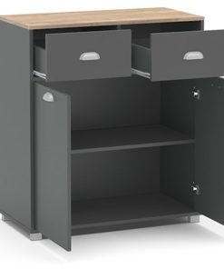 Medidas: 80cm ancho x40cm fondo x 90cm alto.Materiales: Acabado aglomerado melaminizado de 16mm. Color gris grafito combinado con roble aserrado. Tirador ABS pintado en gris plata.