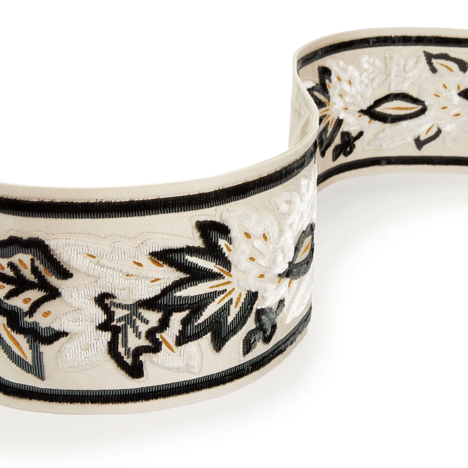 Tejida con un fondo de raso de algodón y utilizando técnicas de terciopelo cortado y sin cortar, esta trenza presenta una guirnalda de hojas estilizadas con reflejos brillantes, bellamente enmarcadas por una franja en el borde.