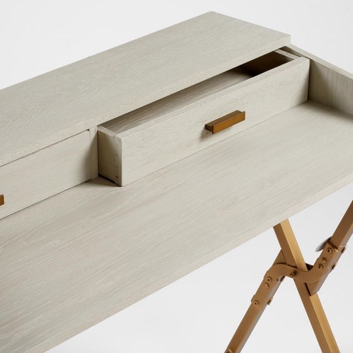 Este elegante escritorio en tono blanco grisáceo combina funcionalidad y estilo, con patas metálicas doradas en forma de tijera y dos prácticos cajones superiores.