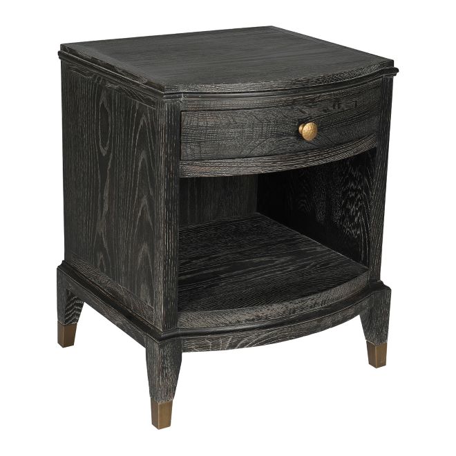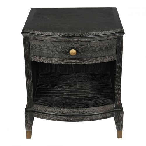 Elaborada en madera de roble, esta mesita de noche en tono oscuro combina elegancia y funcionalidad. Cuenta con un cajón con tirador dorado y un estante abierto, proporcionando almacenamiento práctico y un diseño cómodo para cualquier dormitorio.