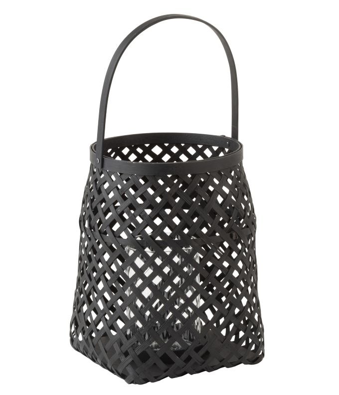 Portavelas de bambú negro con diseño tejido y asa práctica, perfecto para aportar calidez y estilo a cualquier rincón.