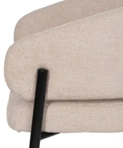 Estructura de líneas redondeas en metal y dm, tapizada en un suave tejido de chenilla beige y relleno de espuma.100% poliéster.
