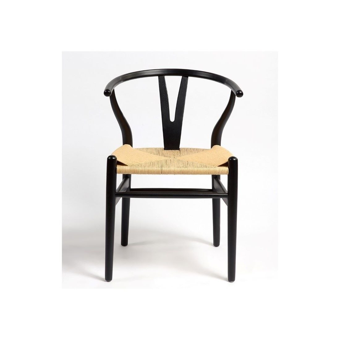 Silla de madera de roble en color negro con asiento de enea trenzada. Su diseño ergonómico y su estilo atemporal la convierten en una pieza versátil y elegante para cualquier espacio.