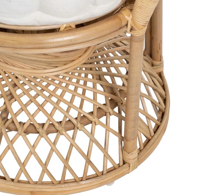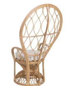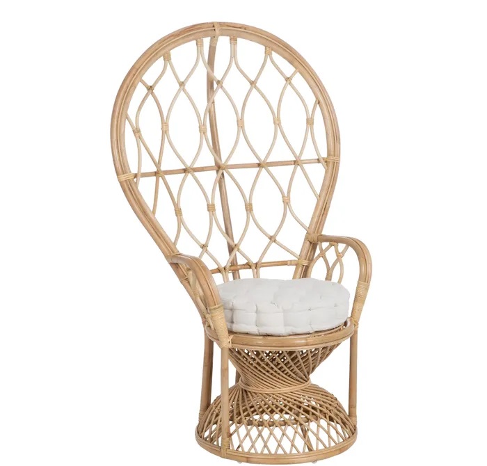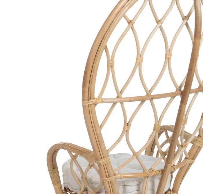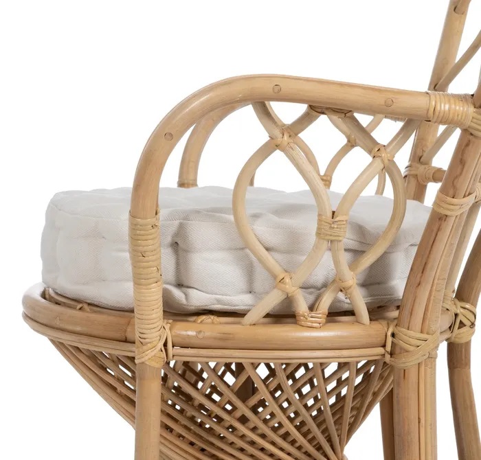 El alto respaldo semicircular,los apoyabrazos y el mullido cojín, lo convierte en una pieza muy confortable. Ideal para la terraza, jardín o un coqueto rincón del salón o dormitorio.