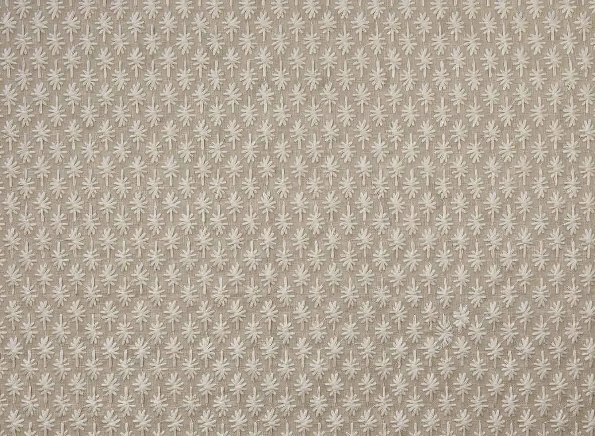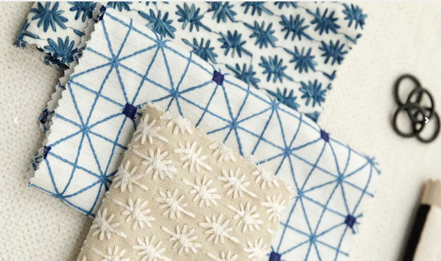 Tela bordada de aspecto artesanal disponible en natural y en fondo blanco con bordados azules. En colores azul y natural.