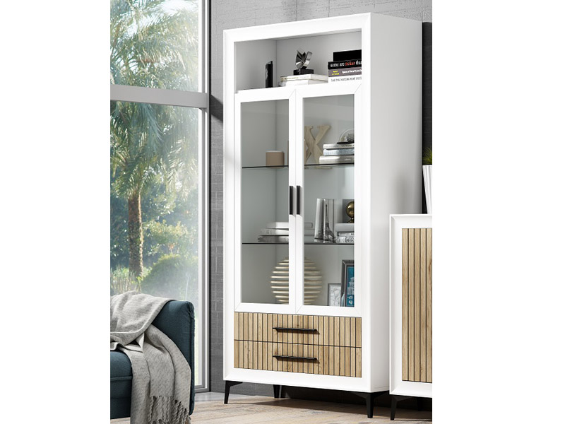 Vitrina de 2 puertas y 2 cajones en color blanco combinado con color salermo.Con patas negras.Medidas: 106cm ancho x 186cm alto x 40cm fondo.Las patas tienen una altura de 13cm.