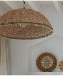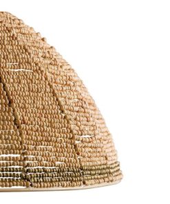 La lámpara de techo en perlas de madera natural y dorado Ø65 cm destaca por su diseño artesanal y su elegancia natural. Su pantalla semiesférica está meticulosamente confeccionada con pequeñas cuentas de madera dispuestas en un trenzado geométrico que alterna acabados naturales con pinceladas doradas. Esta combinación aporta una estética cálida y luminosa que encaja con facilidad en ambientes bohemios, mediterráneos o contemporáneos. Su formato generoso y estructura suspendida convierten esta pieza en el punto focal de cualquier estancia: sobre una mesa de comedor, en el salón o incluso en una entrada con carácter. La luz se filtra suavemente a través de las cuentas, generando una atmósfera acogedora y envolvente. Una pieza decorativa que une funcionalidad y estilo con alma artesanal.
