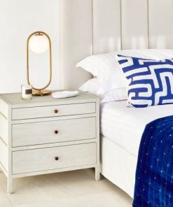Esta sofisticada mesita de noche está fabricada en madera de roble con un elegante acabado blanco grisáceo patinado que aporta frescura y estilo a cualquier espacio. Su diseño limpio y minimalista presenta líneas rectas y detalles laterales en relieve que realzan su apariencia moderna y atemporal. Equipada con tres amplios cajones y delicados tiradores metálicos, ofrece un espacio práctico y organizado para guardar libros, dispositivos o artículos personales. La estructura robusta y el acabado patinado aportan un toque de calidez y luminosidad, ideal para habitaciones de estilo nórdico, rústico o contemporáneo. Esta pieza combina funcionalidad y estética, siendo perfecta para completar la decoración de un dormitorio sofisticado y acogedor.