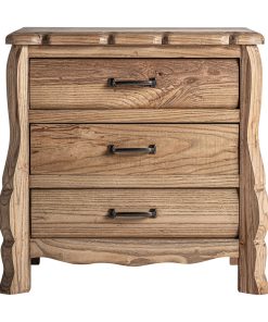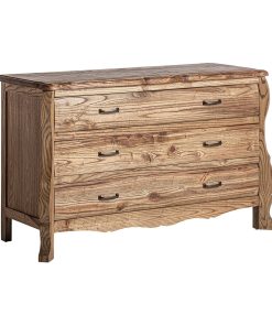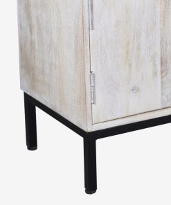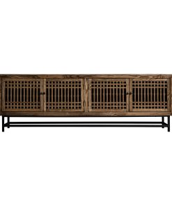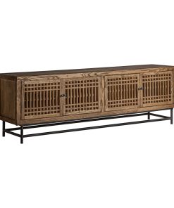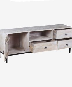 Mueble de TV fabricado en madera natural, con una estructura metálica que aporta estabilidad y un diseño moderno. Incluye cuatro cajones, un compartimento abierto y una puerta lateral, ideal para almacenamiento organizado en cualquier salón.