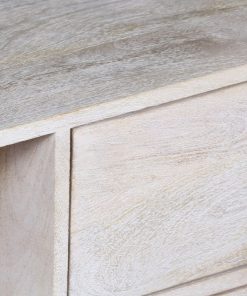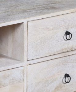 Este mueble de TV combina funcionalidad y diseño contemporáneo gracias a su construcción en madera natural y su sólida base metálica. Con cuatro cajones de diferentes tamaños, un compartimento abierto para dispositivos electrónicos y una puerta lateral, ofrece un amplio espacio para almacenamiento. Su acabado en tonos claros de madera aporta calidez y un estilo atemporal que se adapta a diferentes tipos de decoración. Las asas metálicas de diseño minimalista complementan su estructura, mientras que su base de hierro negro asegura estabilidad y durabilidad. Perfecto para quienes buscan un mueble práctico y estético para completar su espacio de entretenimiento.