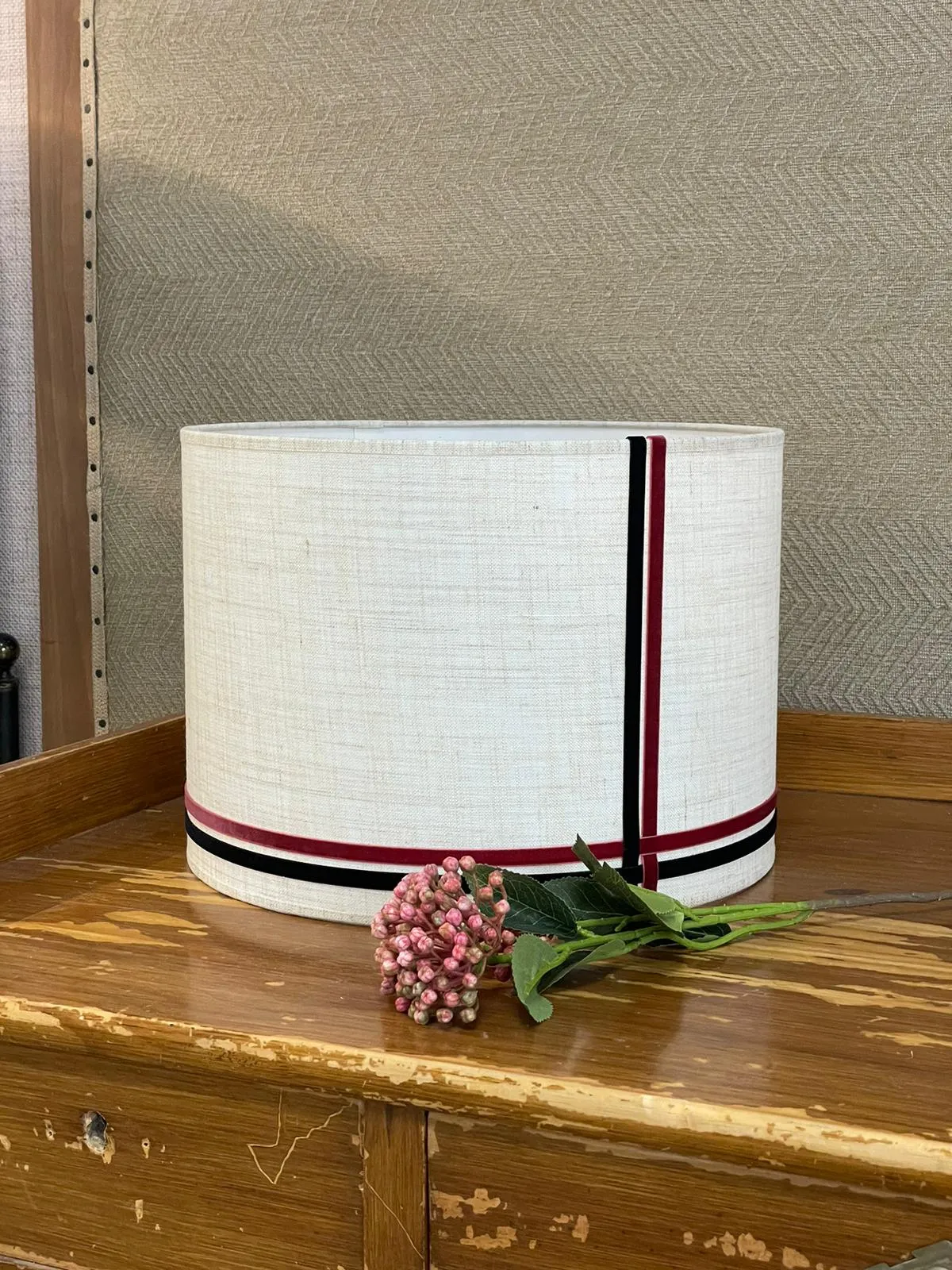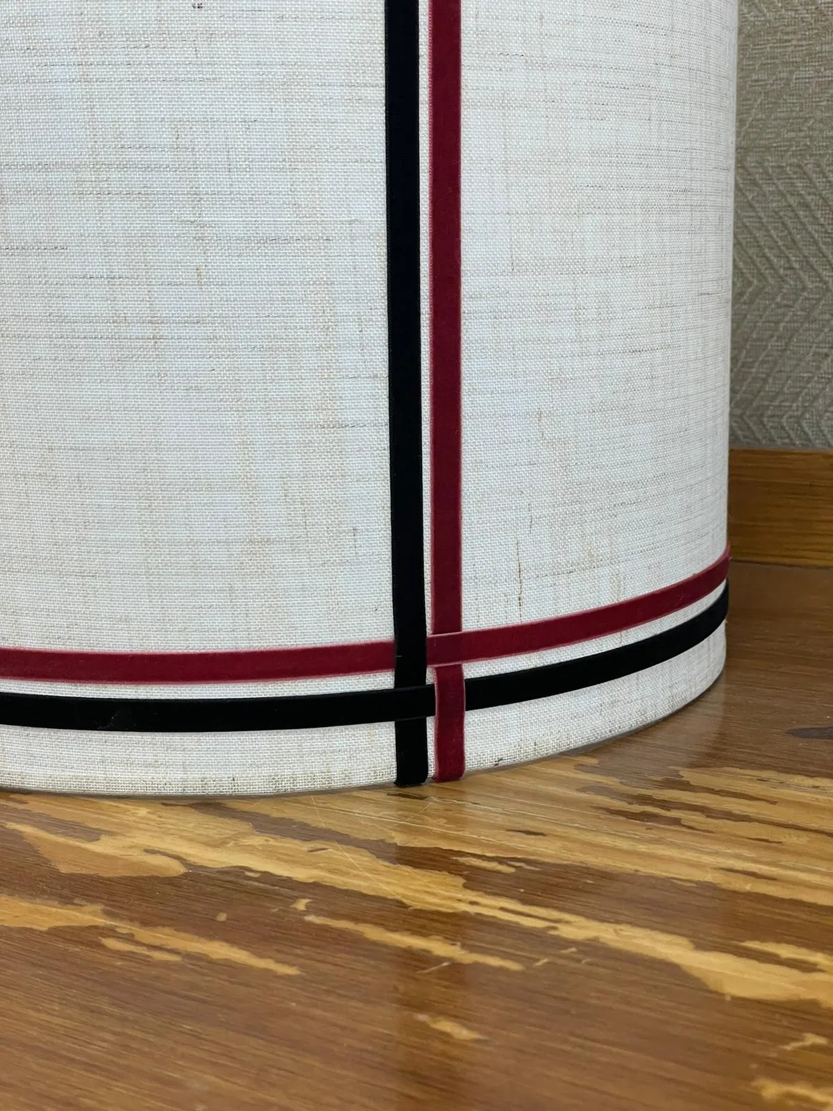Pantalla de base lisa que no pasa desapercibida por su detalle doble en velvet de dos colores que hacen que sea especial. Queda perfecta en cualquier estancia.